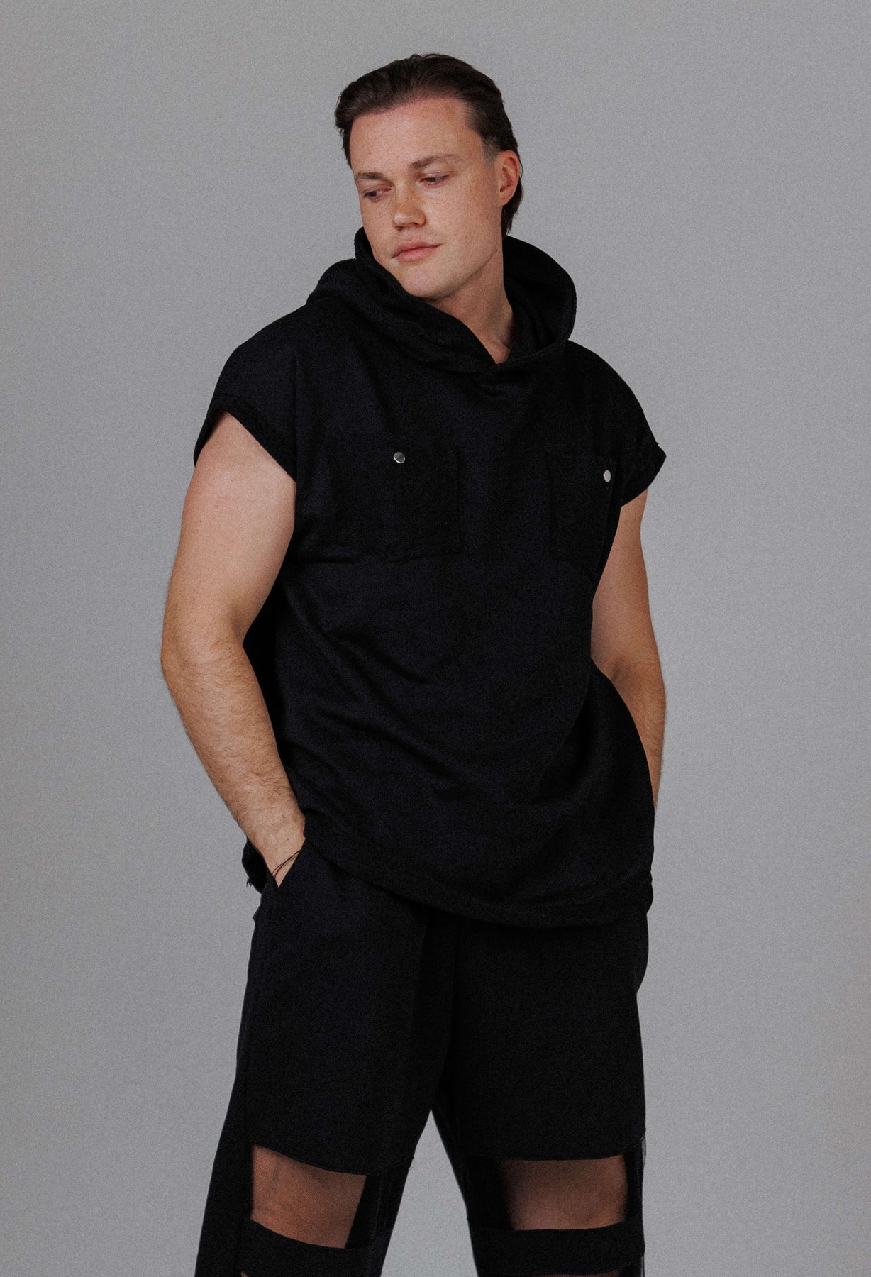 The Eclipse Men’s Hooded Tank Set is crafted from a soft cotton blend, shaped into a relaxed yet commanding silhouette that moves between comfort and defiance. The sleeveless hooded tank carries a quiet intensity with its clean lines and deep hood, while the matching mesh detailed pants introduce contrast through layered panels that reveal movement beneath the surface. Handmade with intention, this set reflects a raw, underground aesthetic rooted in goth and rock culture, designed to feel worn in and unapologetically present.