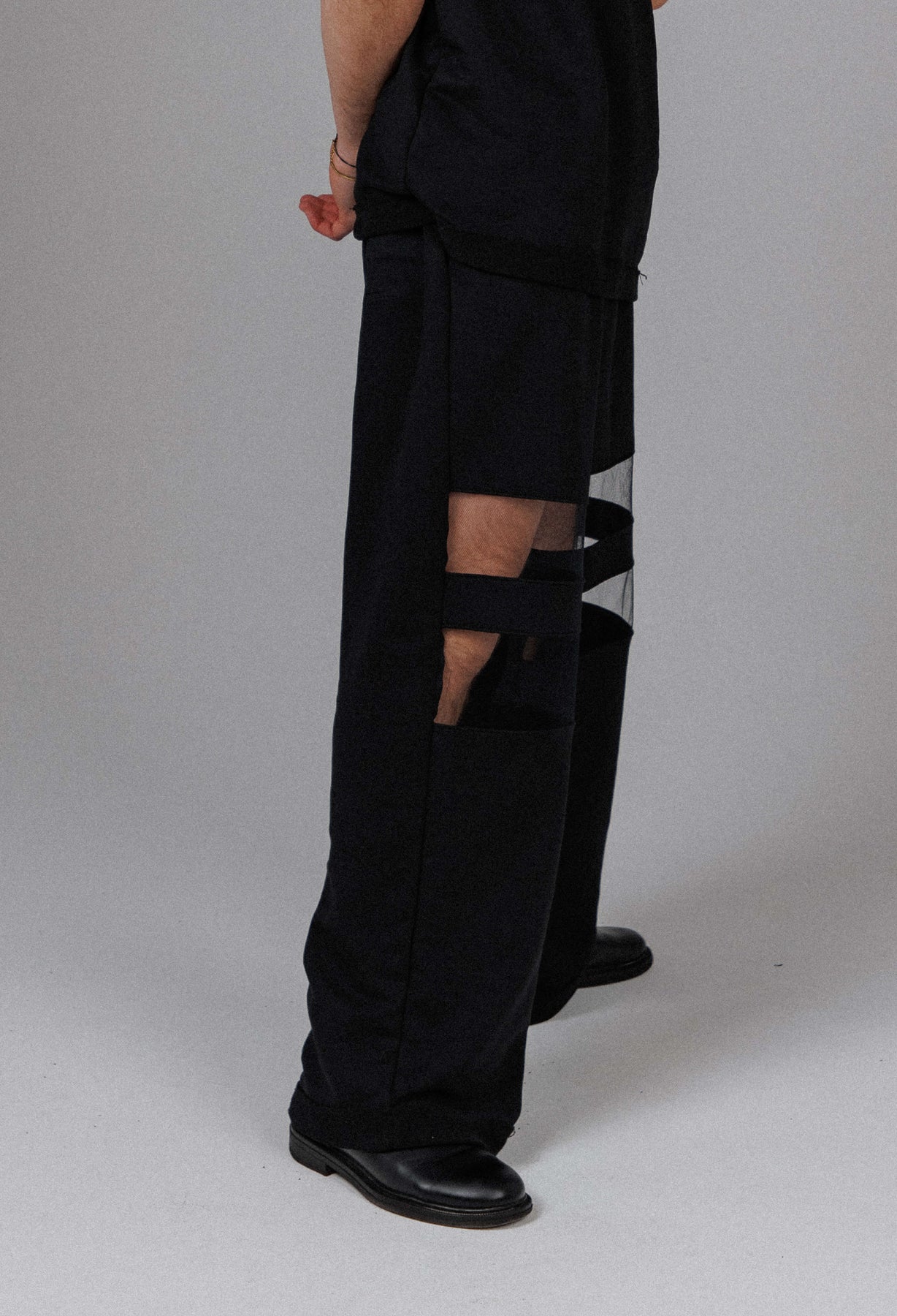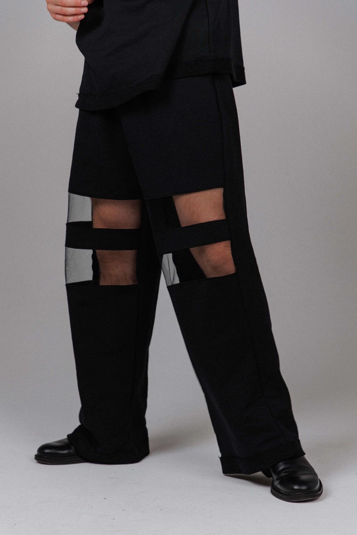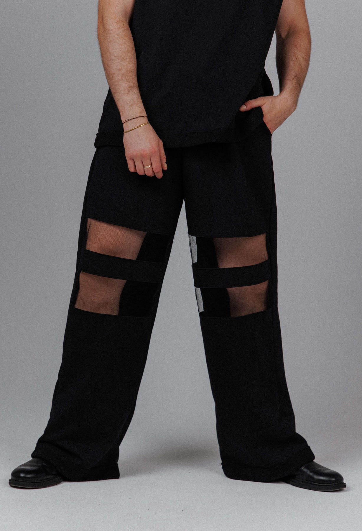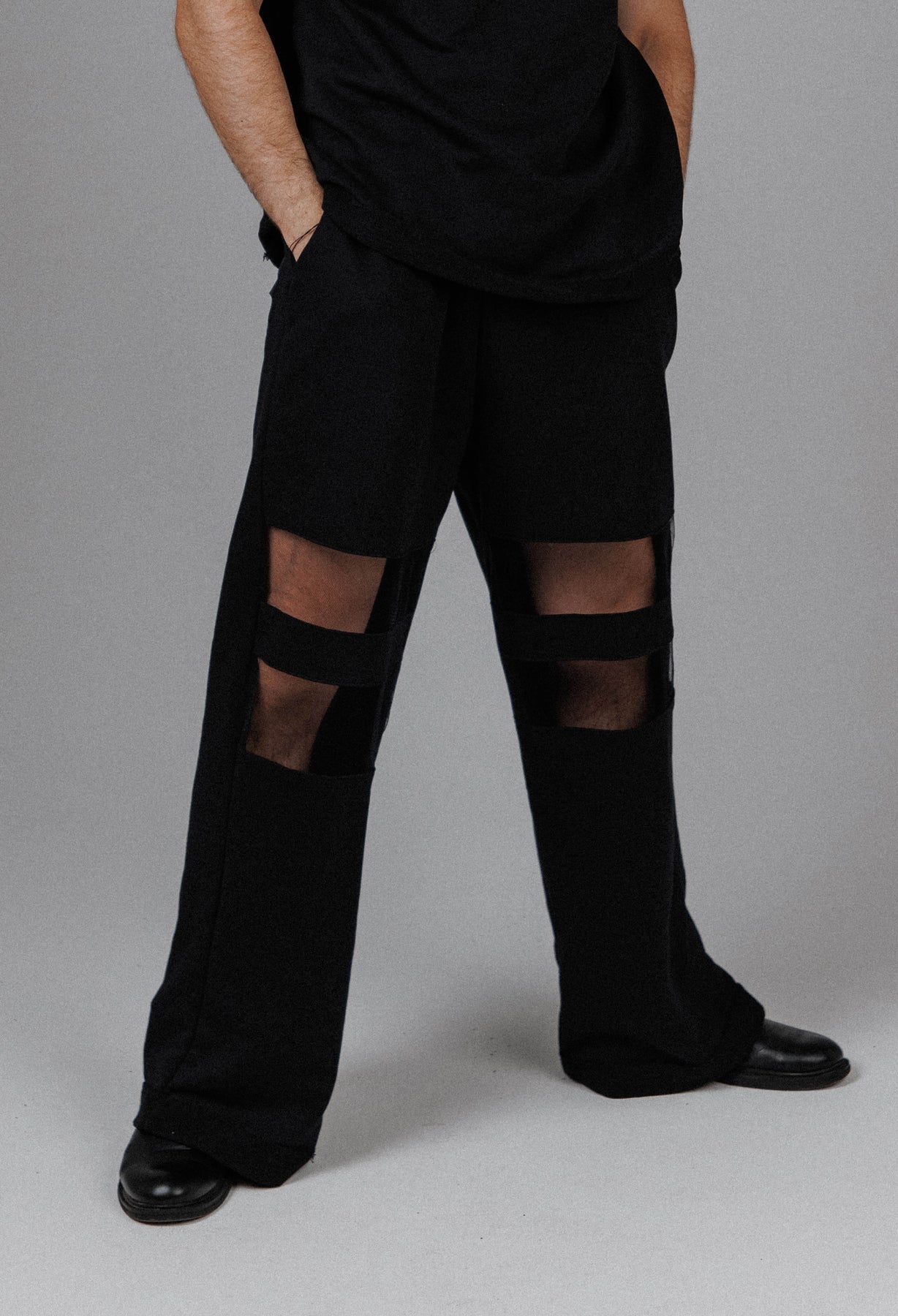The Eclipse Men’s Mesh Pants are crafted from a soft cotton blend, shaped into a relaxed, wide leg silhouette that moves between concealment and exposure. Strategic mesh panels cut through the design, revealing skin beneath layers of shadow for a look that feels raw, controlled, and quietly defiant. Each pair is handmade with intention, giving every piece its own distinct character.
