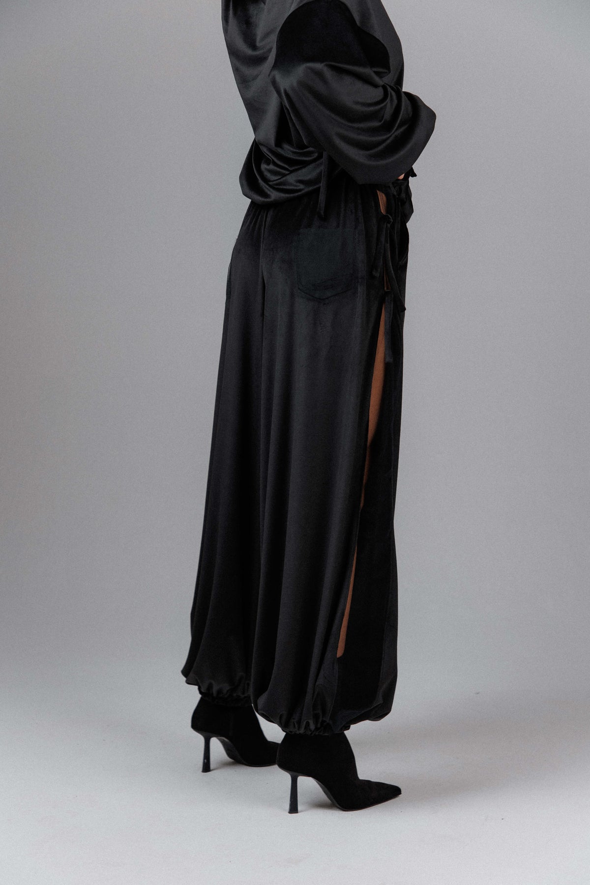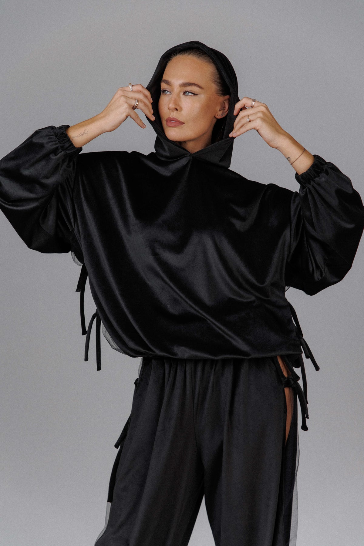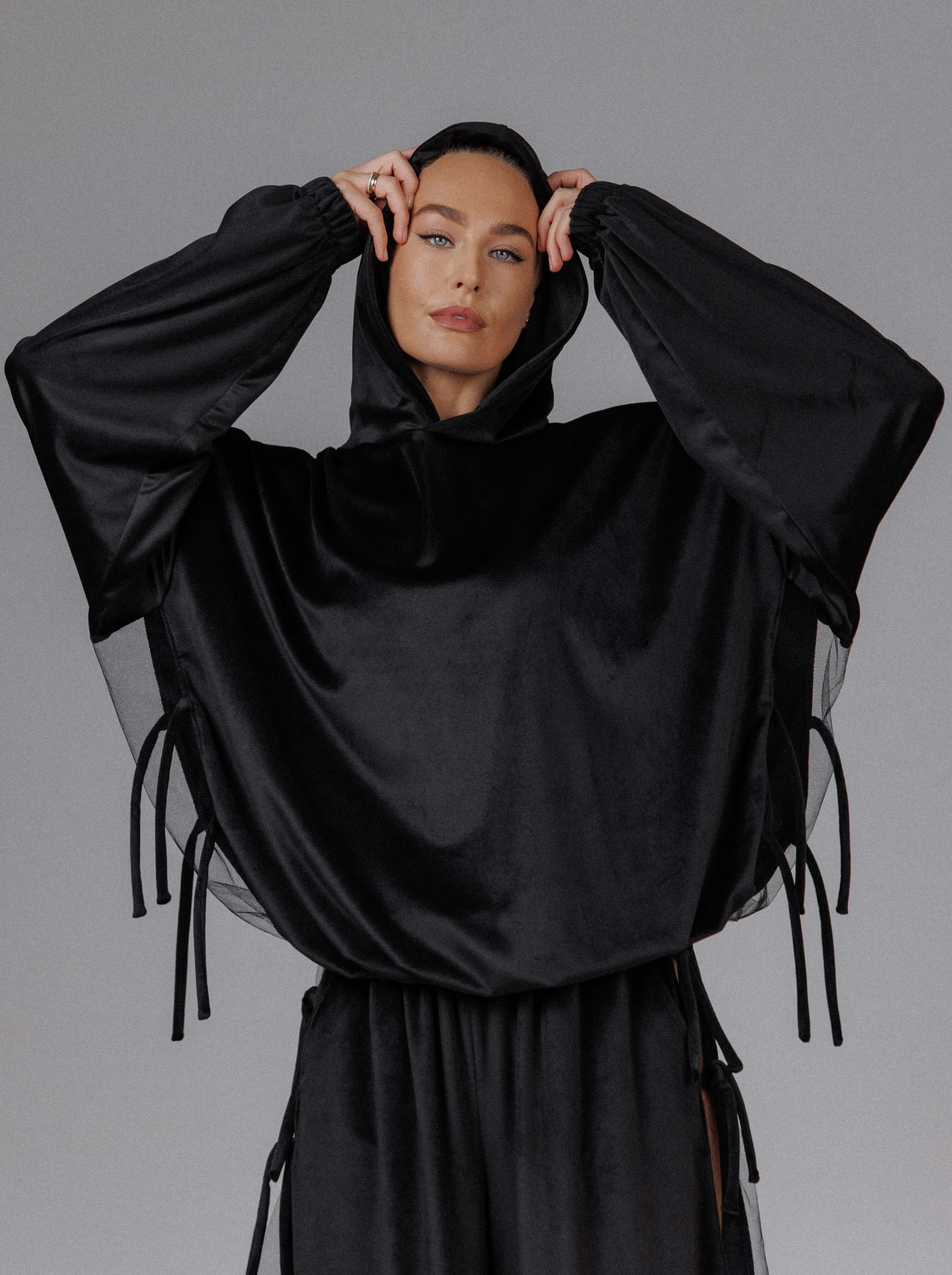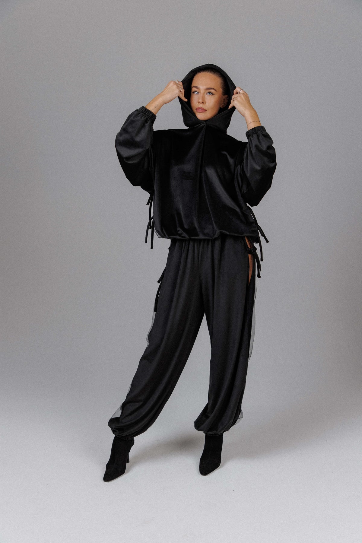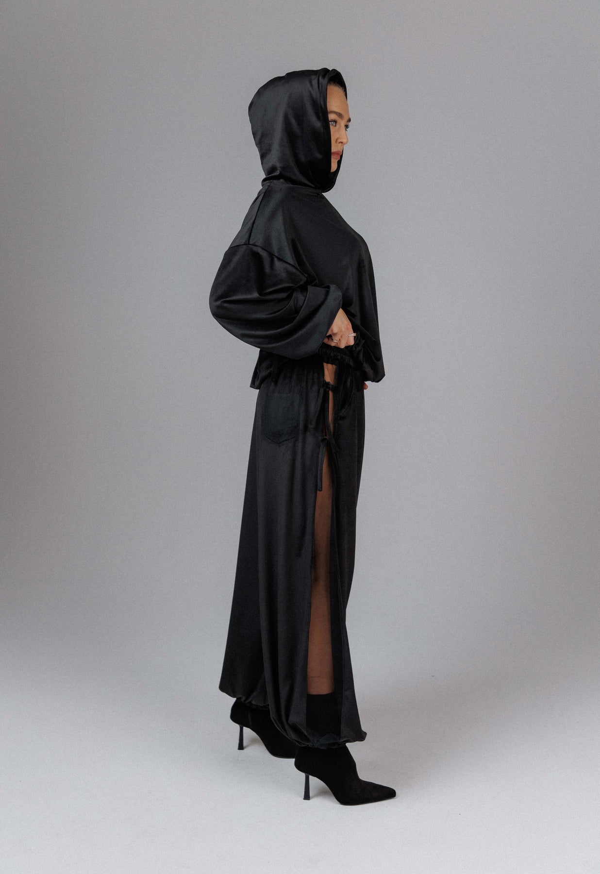 The Eclipse Women’s Cozy Velvet Set is a handmade statement piece crafted from a soft cotton blend and finished with a deep, light-absorbing velvet sheen. Its relaxed silhouette is defined by a draped hood, fluid sleeves, and adjustable side ties that open into subtle slits, creating a balance between concealment and revelation. Designed to flow rather than cling, it wraps the body in comfort while carrying a quiet, shadowed intensity.