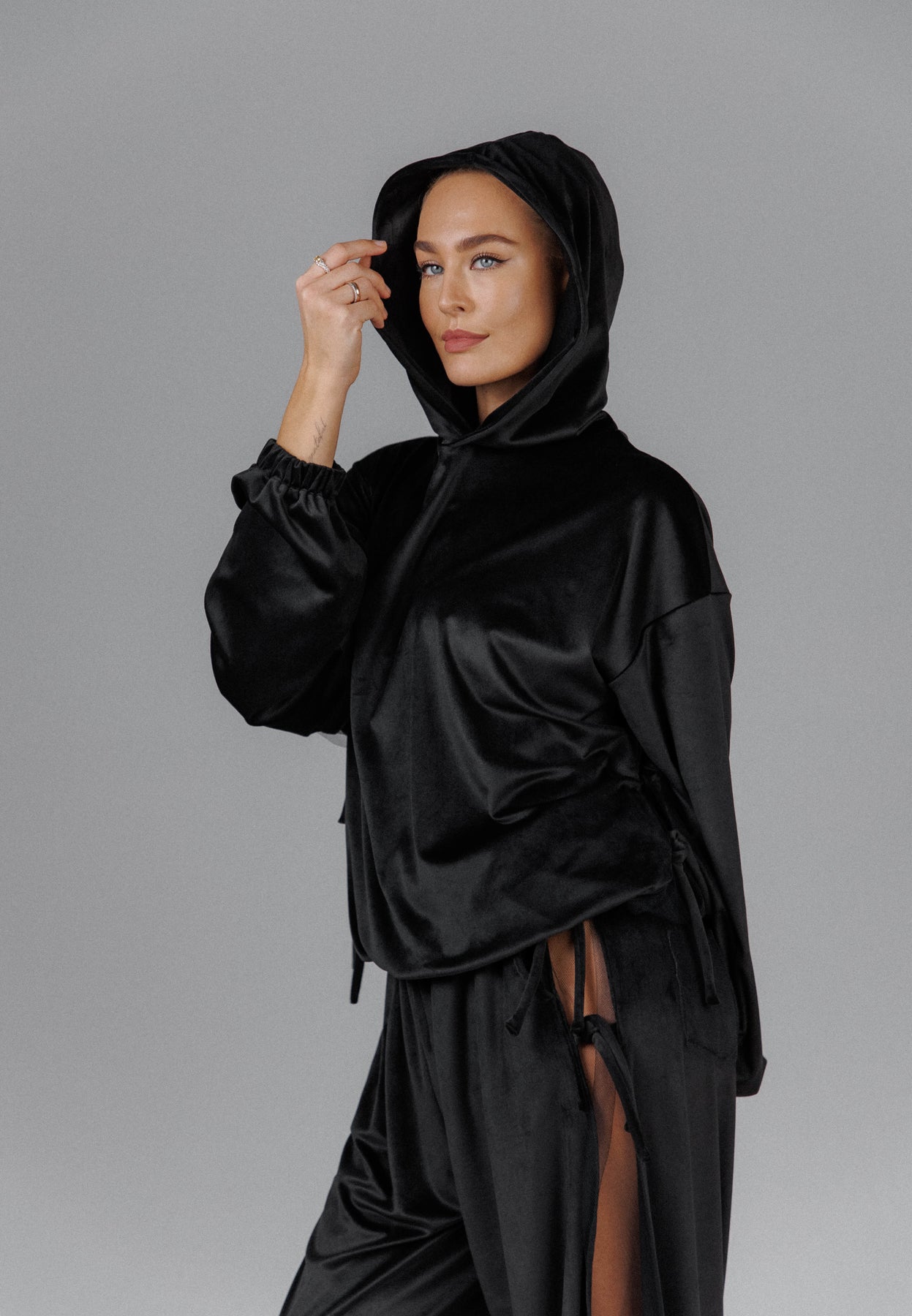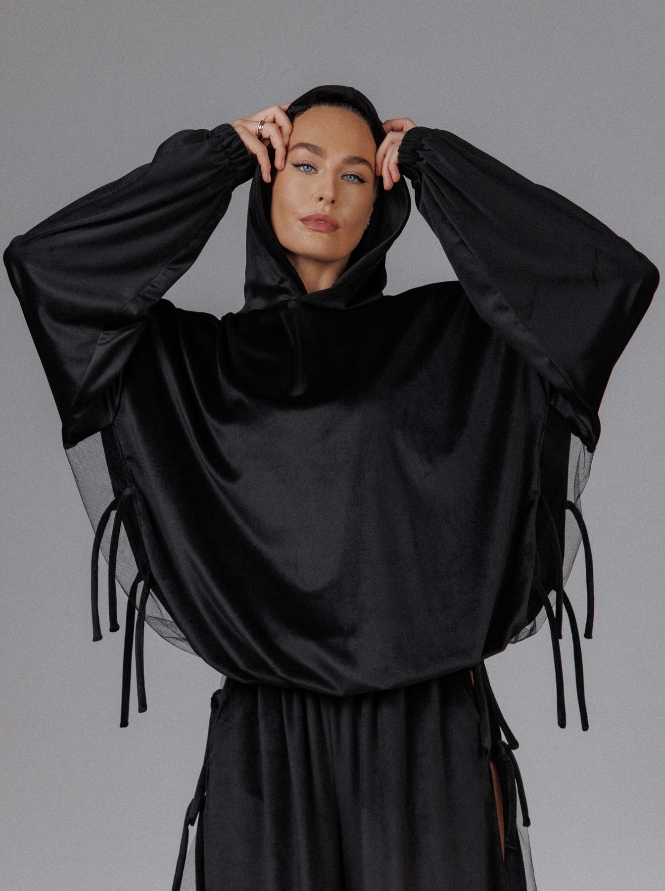 The Eclipse Women’s Cozy Velvet Top is a handmade piece crafted from a soft cotton blend, finished with a deep velvet surface that catches light in subtle, shadowed tones. The relaxed silhouette is defined by a draped hood, voluminous sleeves, and adjustable side ties that allow the shape to shift between fluid and structured. Designed to feel both protective and expressive, it brings comfort wrapped in a dark, intentional presence.