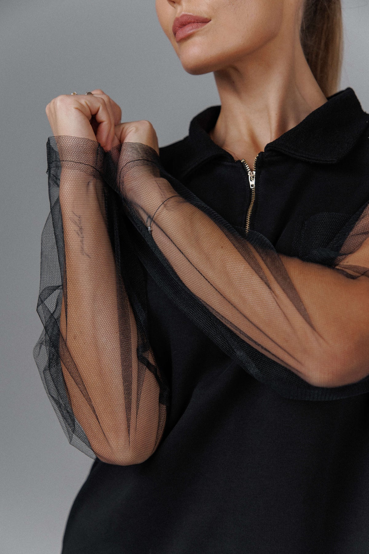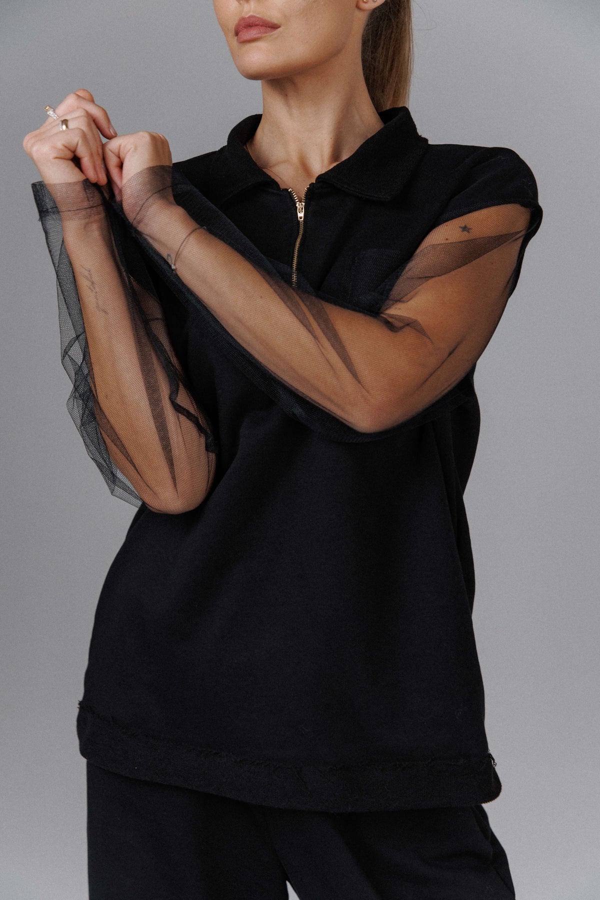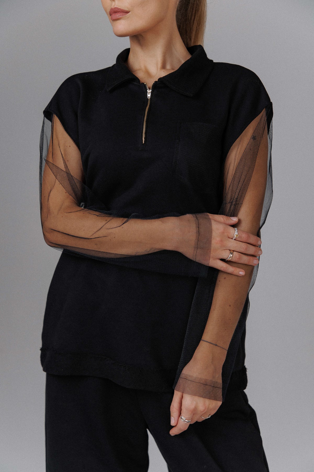 The Eclipse Women’s Nightfall Mesh Top is a handmade piece crafted from a soft cotton blend, shaped to exist between darkness and restraint. Sheer mesh sleeves soften the structured body, creating a quiet contrast that reveals movement without losing control. The zip-front detail and relaxed silhouette give it an understated edge, making it feel both intimate and deliberate. Designed for alternative and gothic wardrobes, it carries a sense of mystery that feels worn in rather than performed.