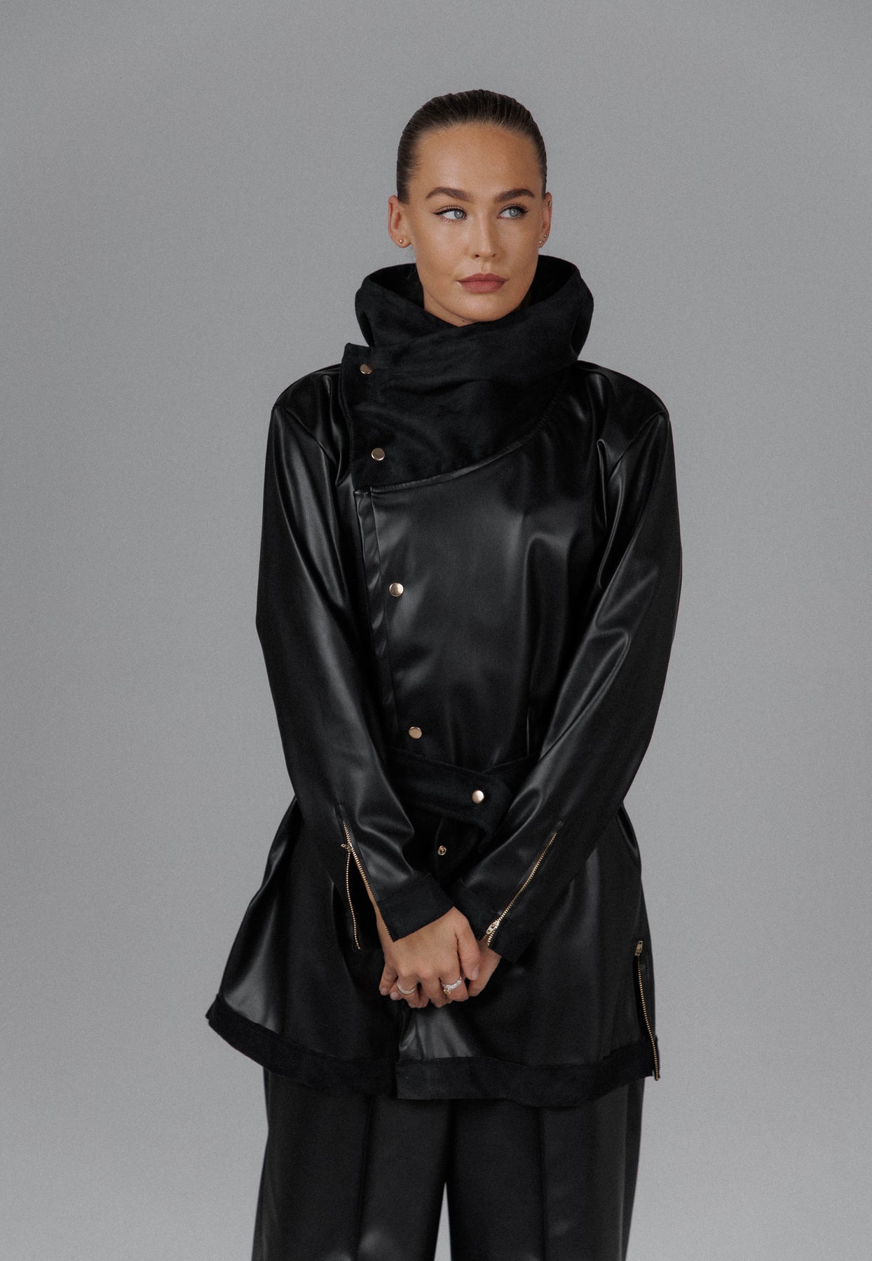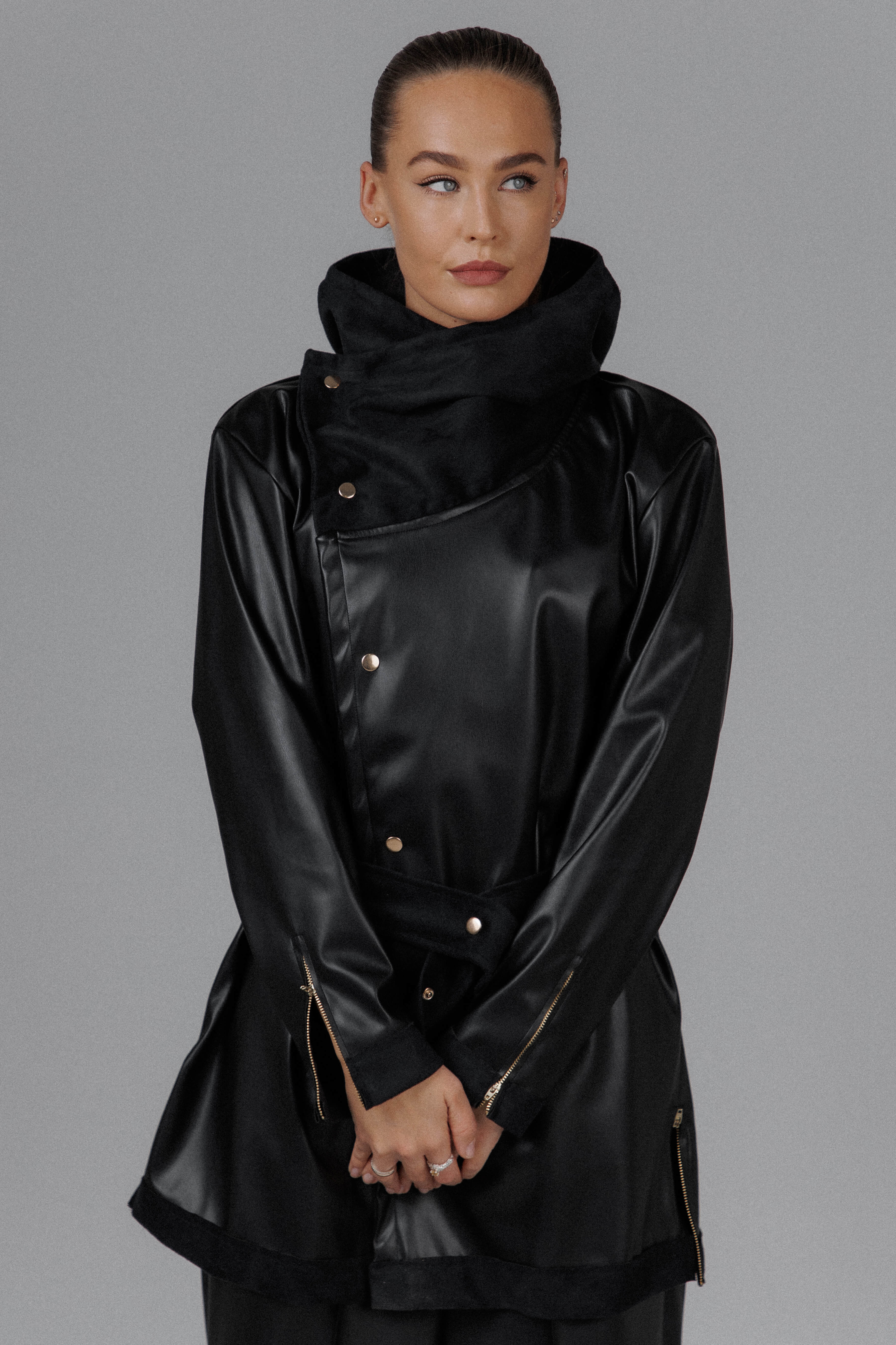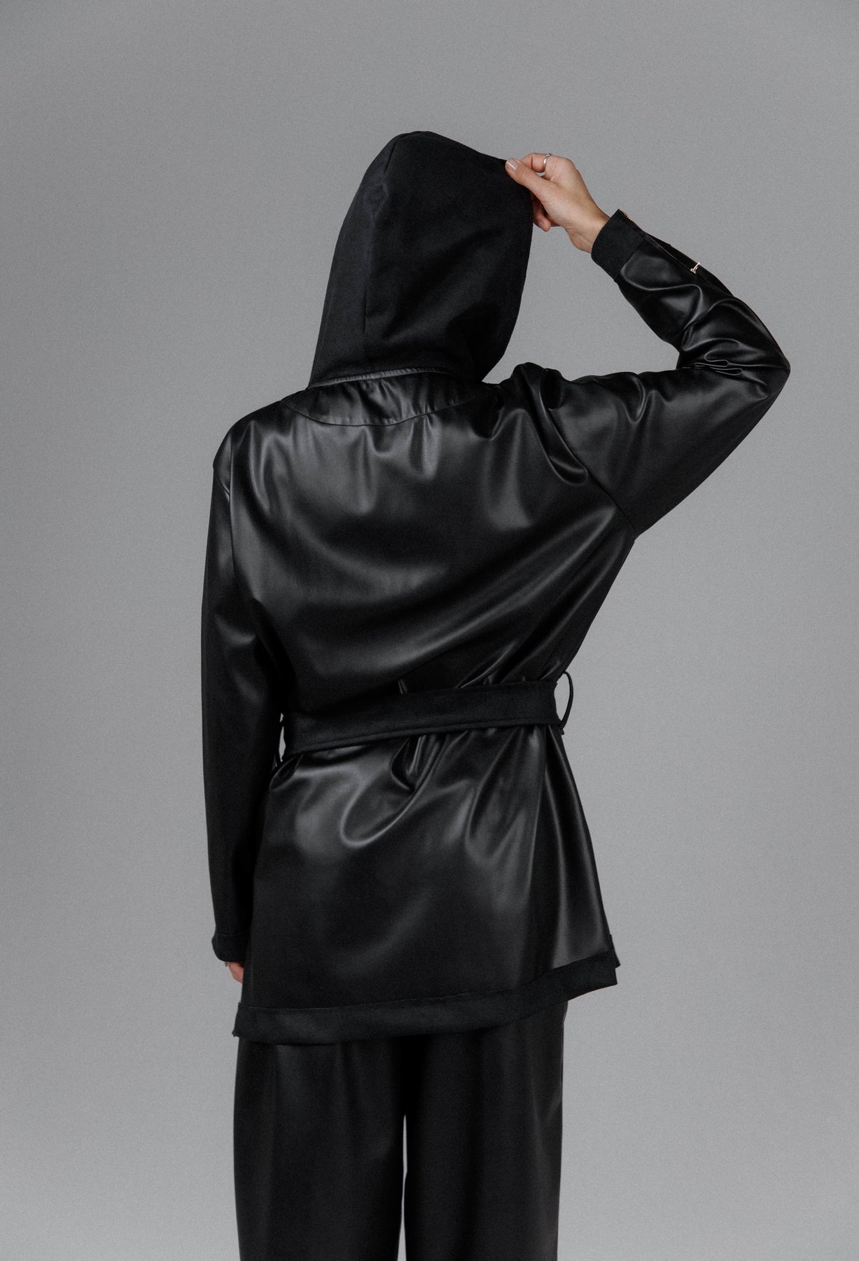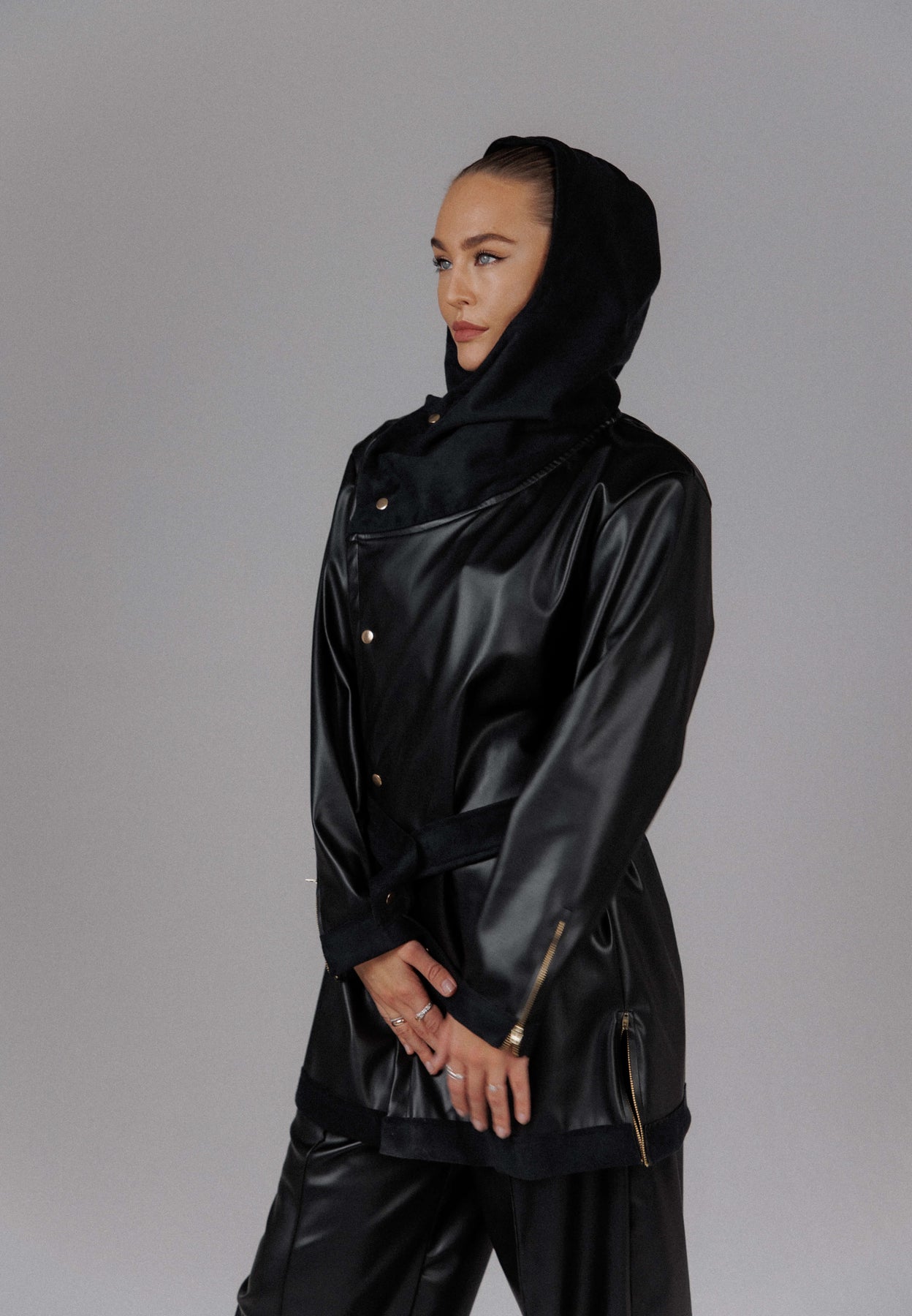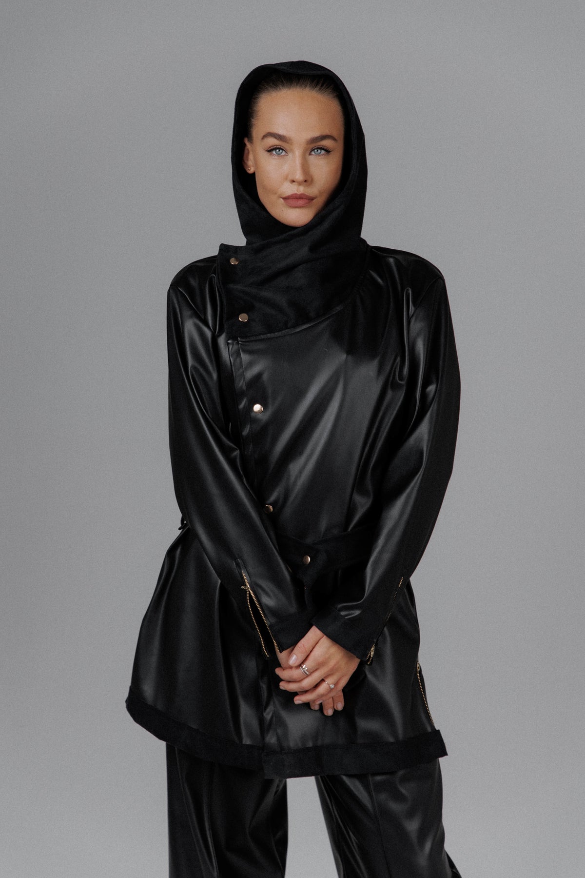 The Eclipse Women’s Hooded Leather Set is a handmade statement crafted from a blend of cotton and smooth faux leather, designed to sit between armor and comfort. The structured jacket features a sculpted hood, asymmetrical snap closure, and defined waist tie that sharpens the silhouette while keeping a sense of fluid movement. The matte sheen of the faux leather contrasts subtly with the softness of cotton details, creating a look that feels deliberate, guarded, and quietly commanding.