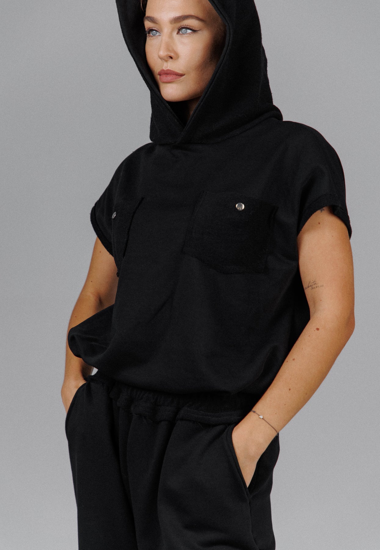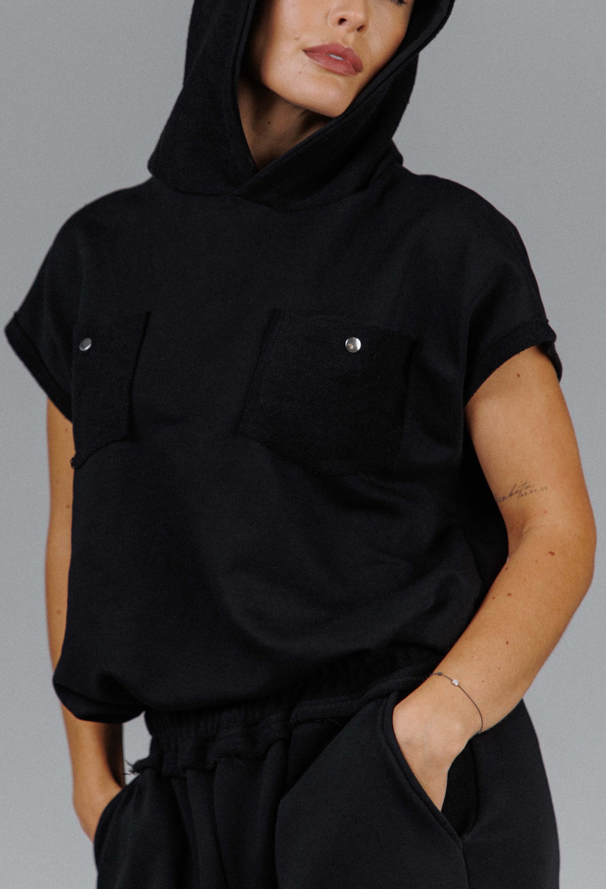 Designed as part of a two piece set, it pairs seamlessly with the matching pants for a complete Eclipse look, yet stands strong on its own layered or worn solo. Each piece can also be purchased separately. Handmade in limited quantities, this hooded tank is made for everyday wear with an edge, meant to be lived in and worn without compromise.